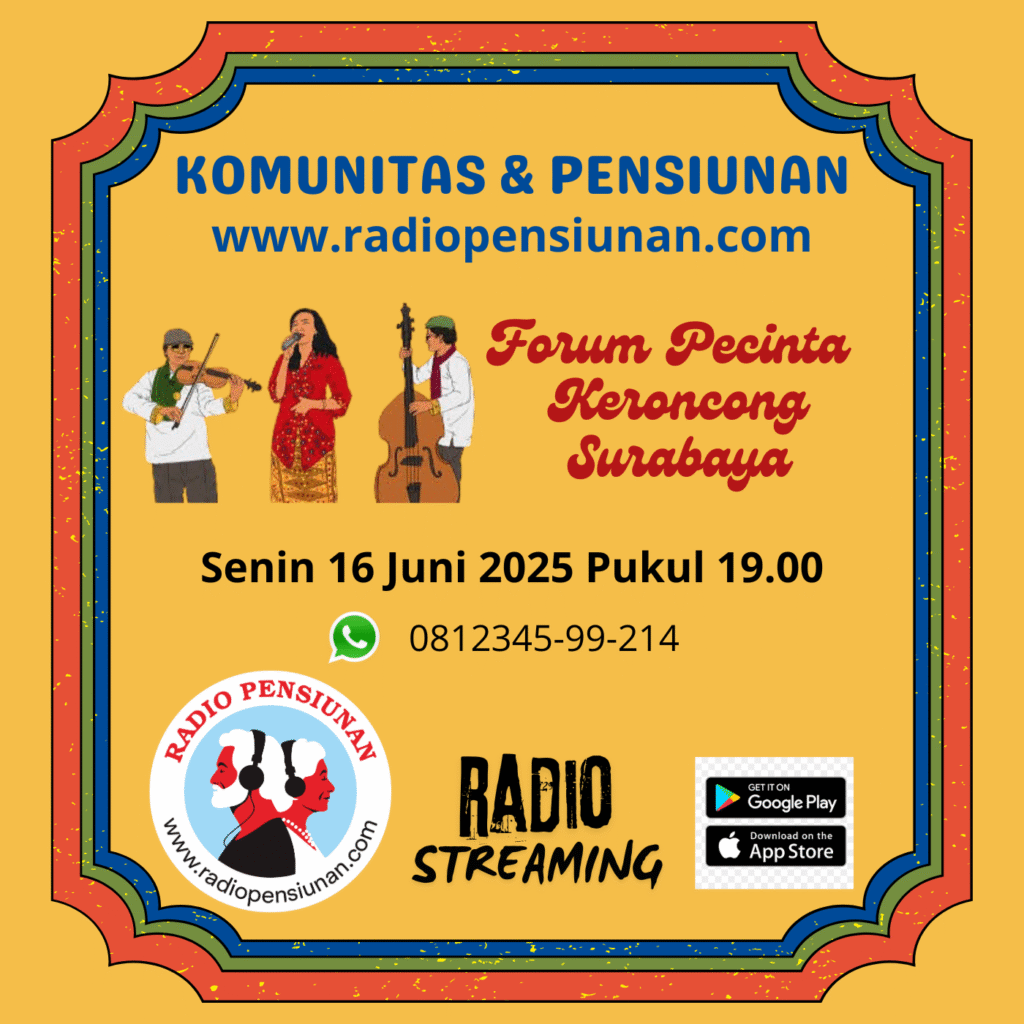 RADIOPENSIUNAN.COM Program Komunitas & Pensiunan untuk Edisi Senin 16 Juni 2025 Pukul 19.00 akan menampilkan Forum Pecinta Keroncong Surabaya. Salah